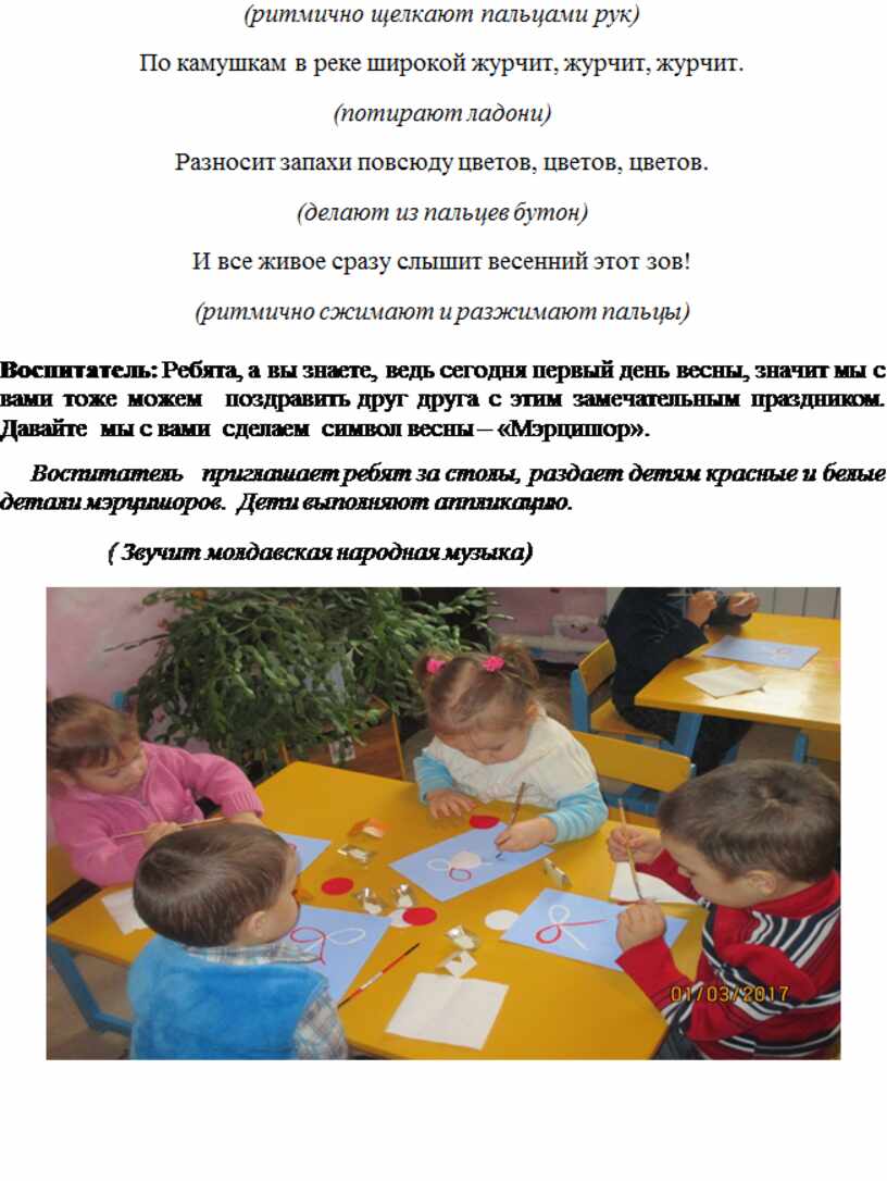 Воспитатель: Ребята, а вы знаете, ведь сегодня первый день весны, значит мы с вами тоже можем поздравить друг друга с этим замечательным праздником. Давайте мы с вами сделаем символ весны – «Мэрцишор».