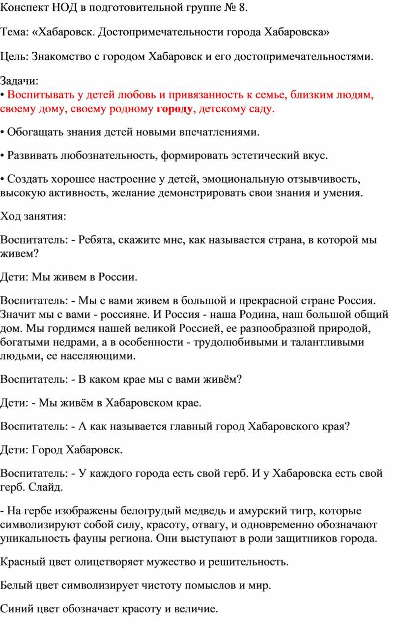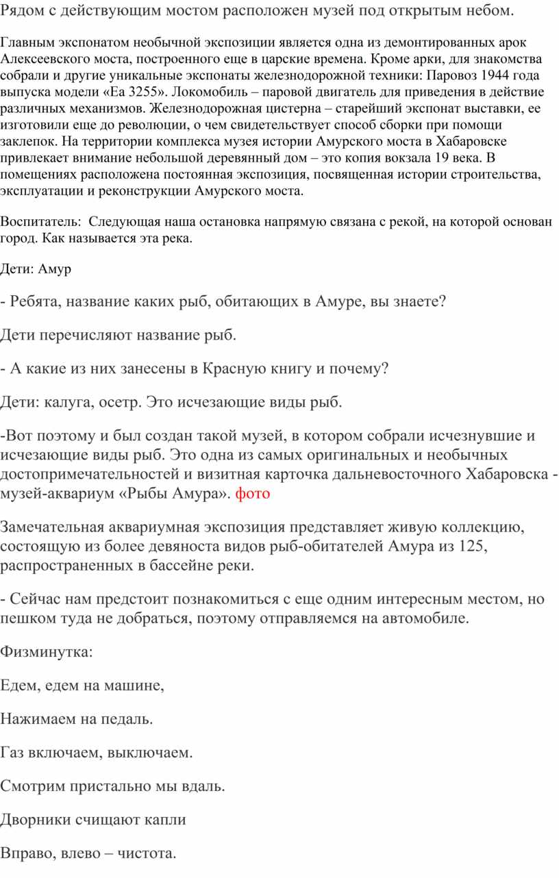 Воспитатель: - Ребята, давайте сейчас с вами совершим экскурсию по городу Хабаровску. Я буду вашим экскурсоводом или по - другому, можно, сказать гидом в этом путешествии, а вы, надеюсь, будете мне помогать. А сейчас - в путь!