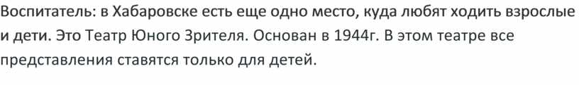 Воспитатель: в Хабаровске есть еще одно место, куда любят ходить взрослые и дети. Это Театр Юного Зрителя. Основан в 1944г. В этом театре все представления ставятся только для детей.