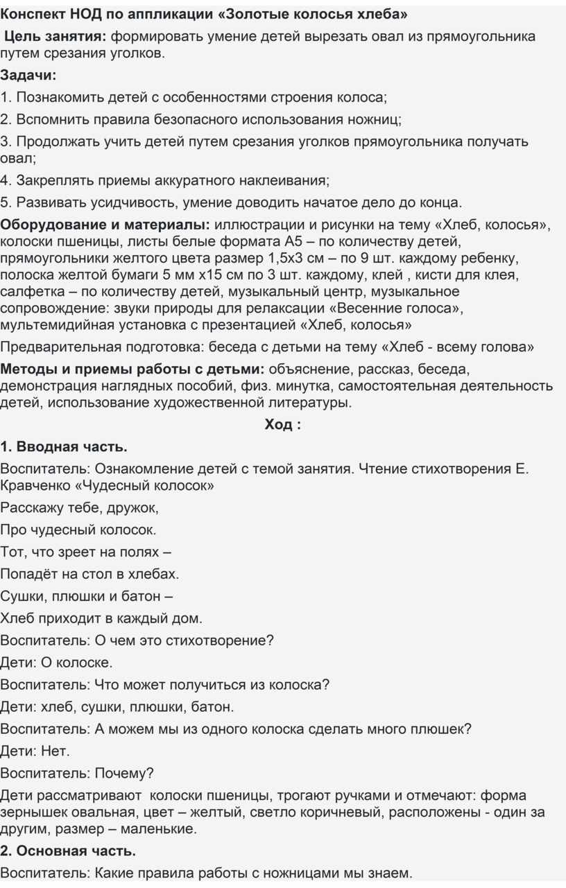 Конспект НОД по аппликации «Золотые колосья хлеба»