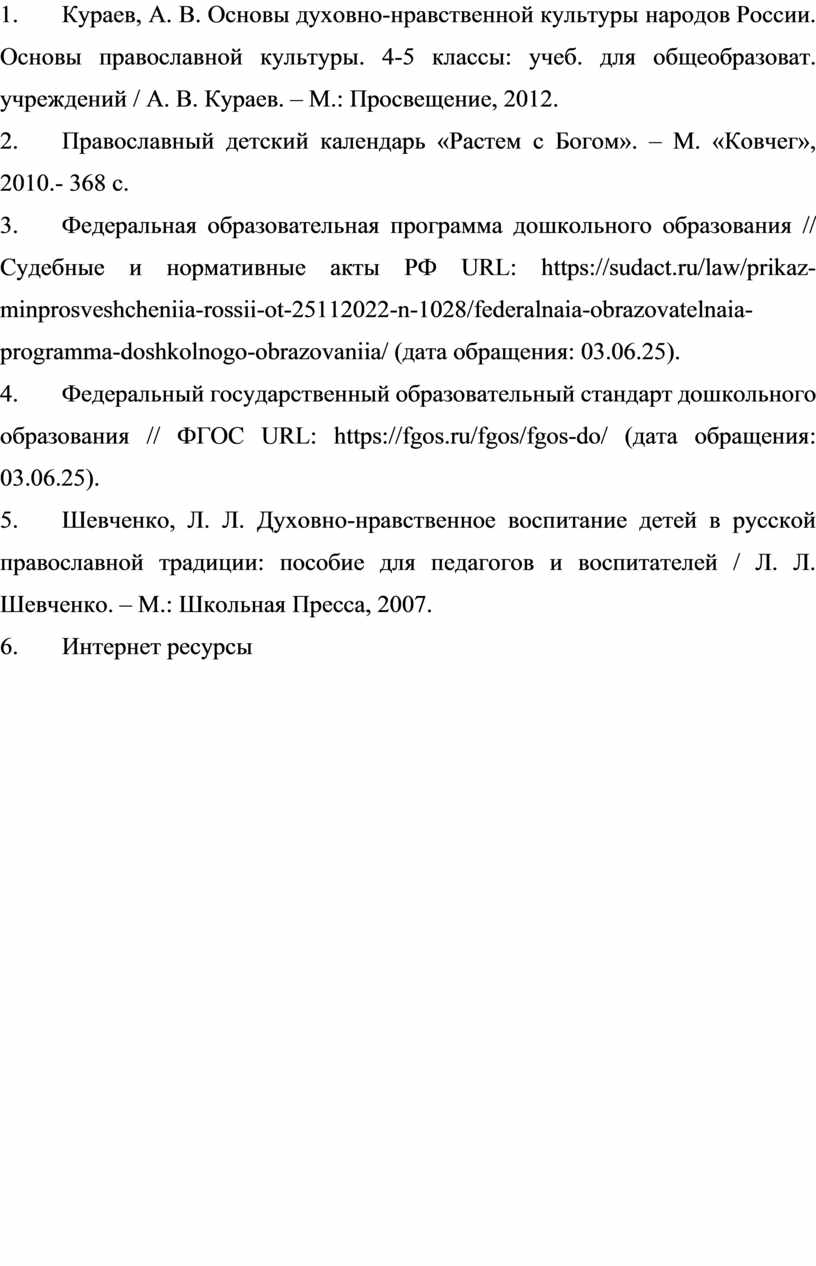 10. Шевченко, Л. Л. Духовно-нравственное воспитание детей в русской православной традиции: пособие для педагогов и воспитателей / Л. Л. Шевченко. – М.: Школьная Пресса, 2007.
