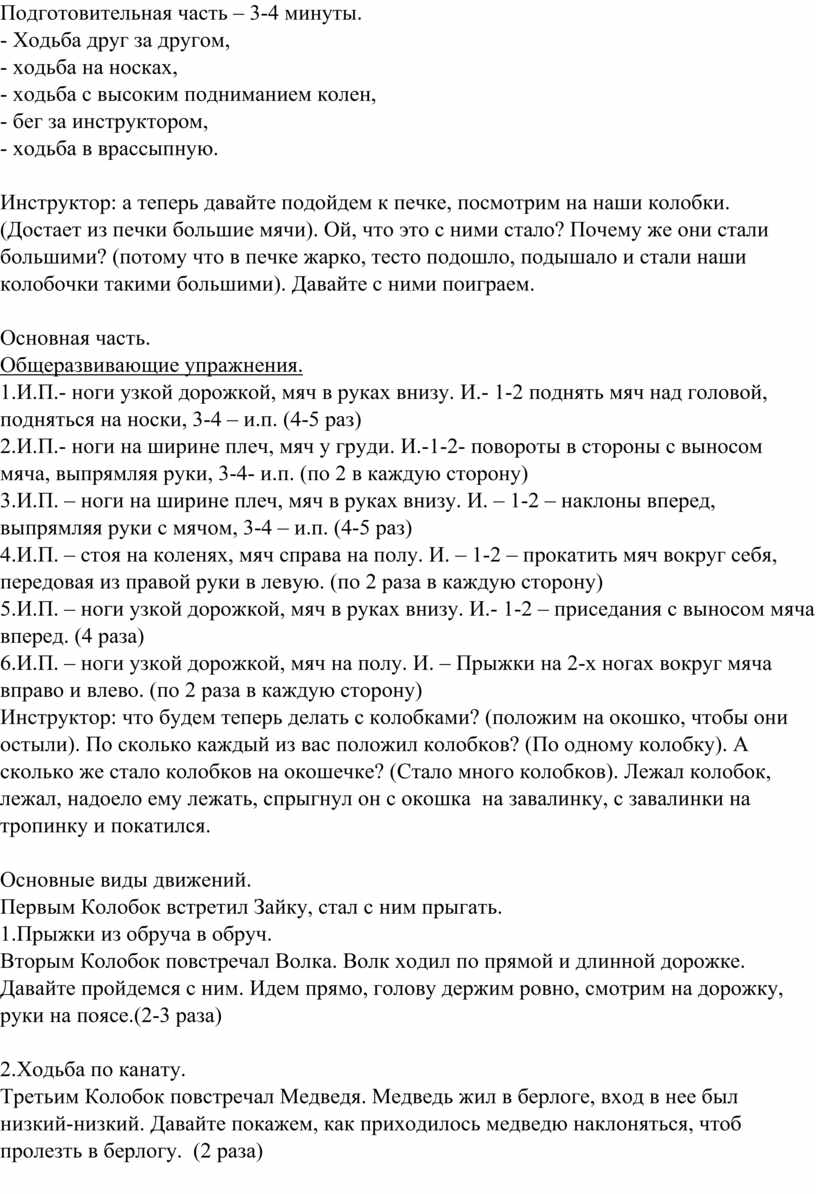 Детям было предложено совершить увлекательное путешествие в сказку «Колобок», выполнения занимательную разминку с различными видами ходьбы, бега, которые были проведены поточным способом с использованием музыки, без пауз и остановок, что значительно повысило плотность занятия. Цель данных упражнений подготовить организм к нагрузке.