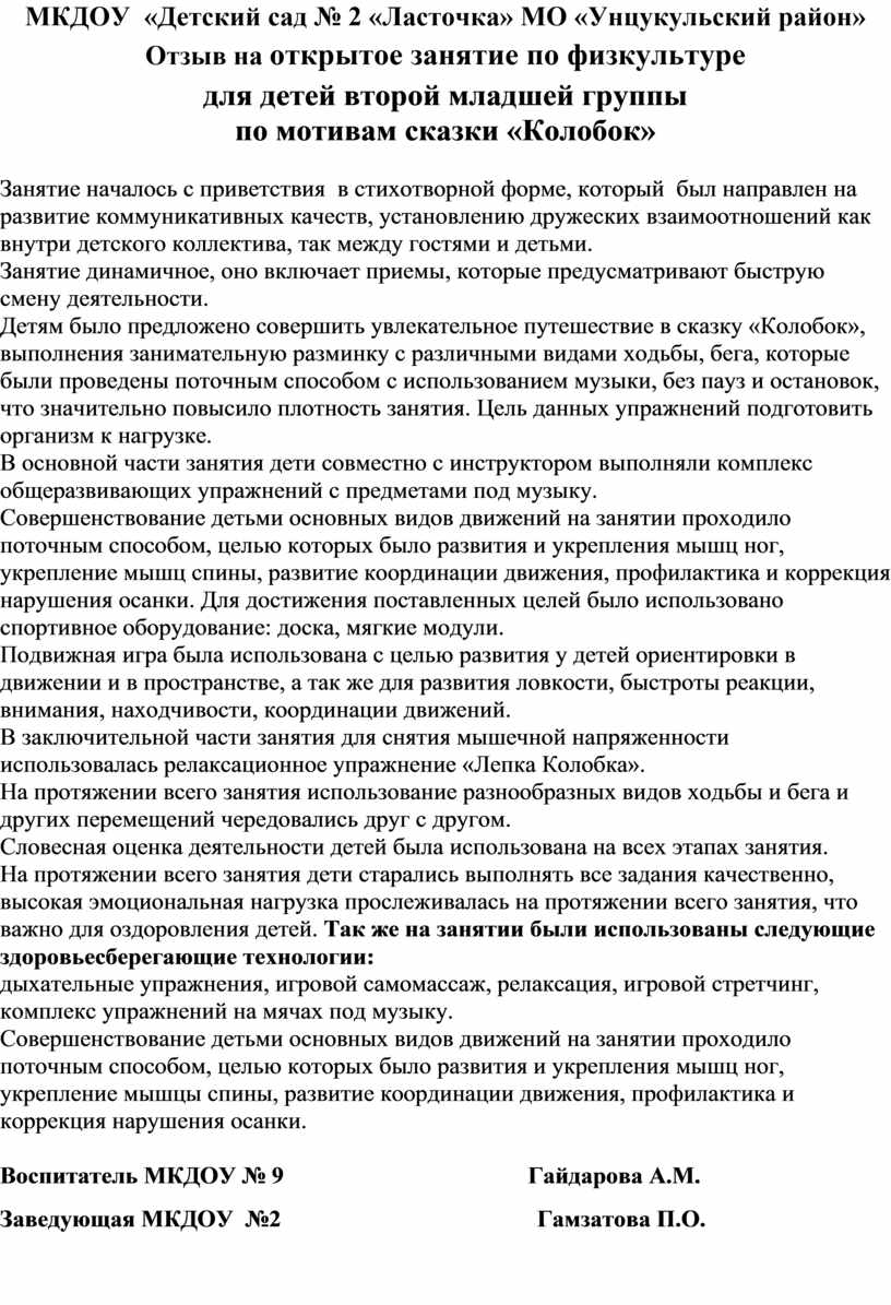 Отзыв на открытое занятие по физкультуре