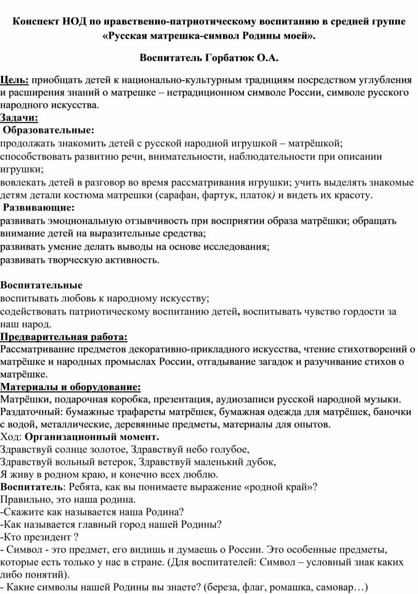 Конспект НОД по нравственно-патриотическому воспитанию в средней группе «Русская матрешка-символ Родины моей».