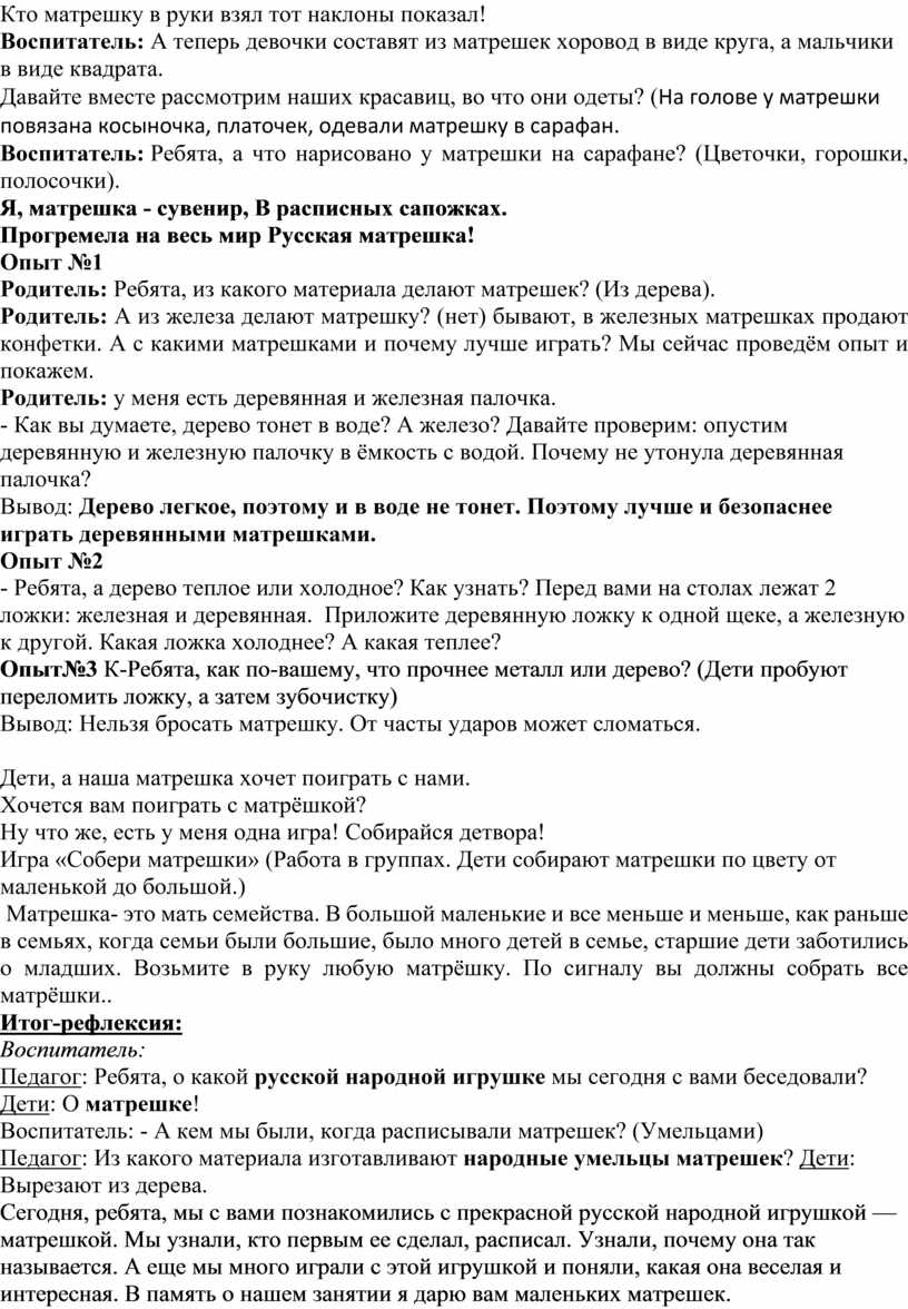 Родитель: А из железа делают матрешку? (нет) бывают, в железных матрешках продают конфетки. А с какими матрешками и почему лучше играть? Мы сейчас проведём опыт и покажем.