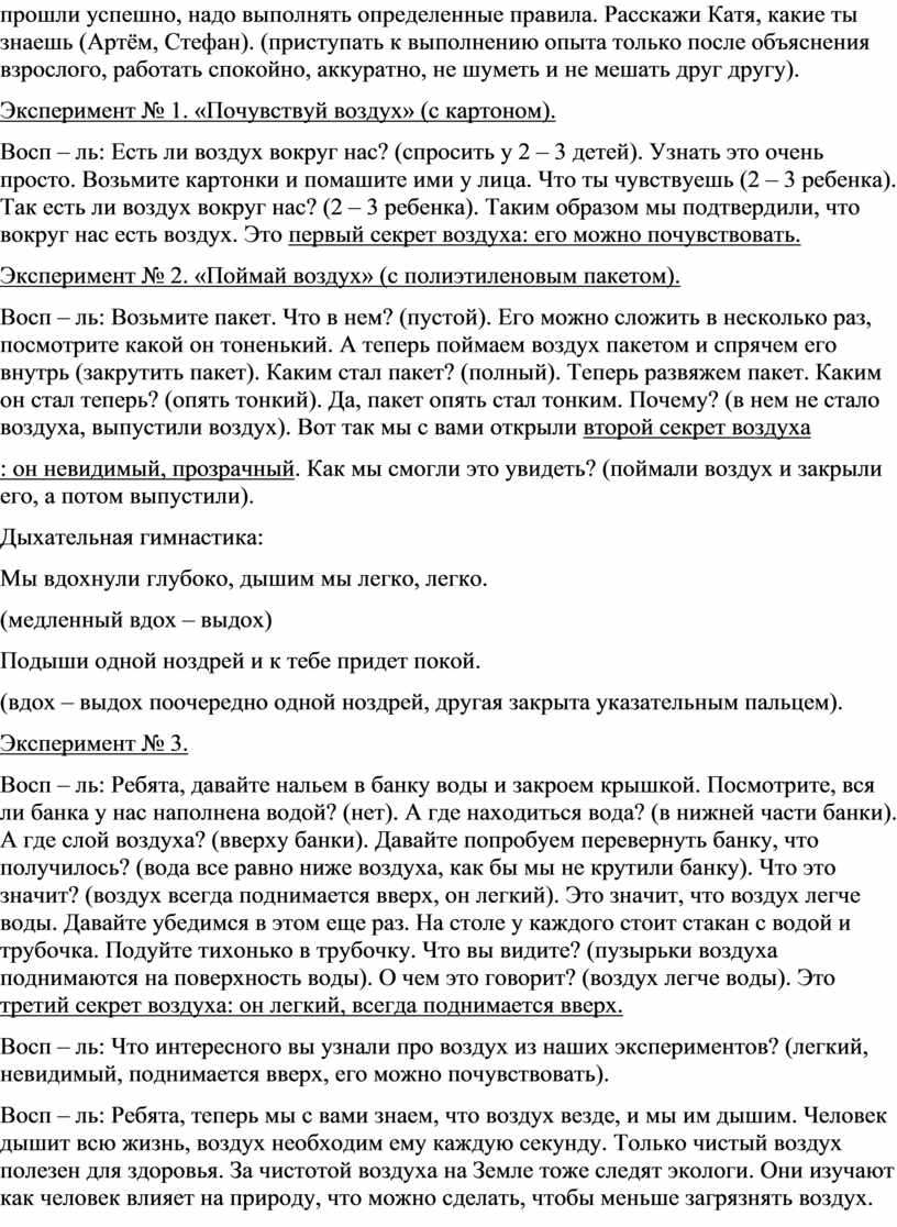 Восп – ль: Ребята, давайте нальем в банку воды и закроем крышкой. Посмотрите, вся ли банка у нас наполнена водой? (нет). А где находиться вода? (в нижней части банки). А где слой воздуха? (вверху банки). Давайте попробуем перевернуть банку, что получилось? (вода все равно ниже воздуха, как бы мы не крутили банку). Что это значит? (воздух всегда поднимается вверх, он легкий). Это значит, что воздух легче воды. Давайте убедимся в этом еще раз. На столе у каждого стоит стакан с водой и трубочка. Подуйте тихонько в трубочку. Что вы видите? (пузырьки воздуха поднимаются на поверхность воды). О чем это говорит? (воздух легче воды). Это третий секрет воздуха: он легкий, всегда поднимается вверх.