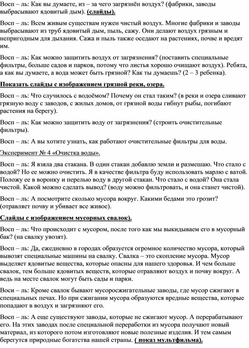 Восп – ль: Да, ежедневно в городах образуется огромное количество мусора, который вывозят специальные машины на свалку. Свалка – это скопление мусора. Мусор выделяет ядовитые вещества, которые опасны для нашего здоровья. И чем больше свалок, тем больше ядовитых веществ, которые отравляют воздух и почву вокруг. А ведь на месте свалок могут быть сады и парки.