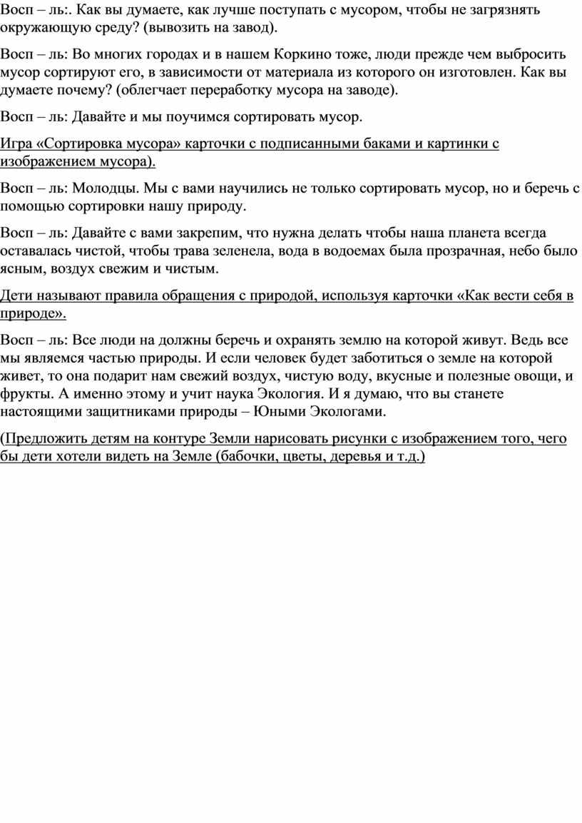 Восп – ль:. Как вы думаете, как лучше поступать с мусором, чтобы не загрязнять окружающую среду? (вывозить на завод).