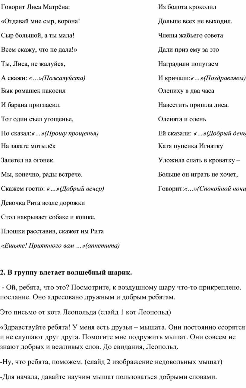«Здравствуйте ребята! У меня есть друзья – мышата. Они постоянно ссорятся и не слушают друг друга. Помогите мне подружить мышат. Они совсем не знают добрых и вежливых слов. До свидания, Леопольд.