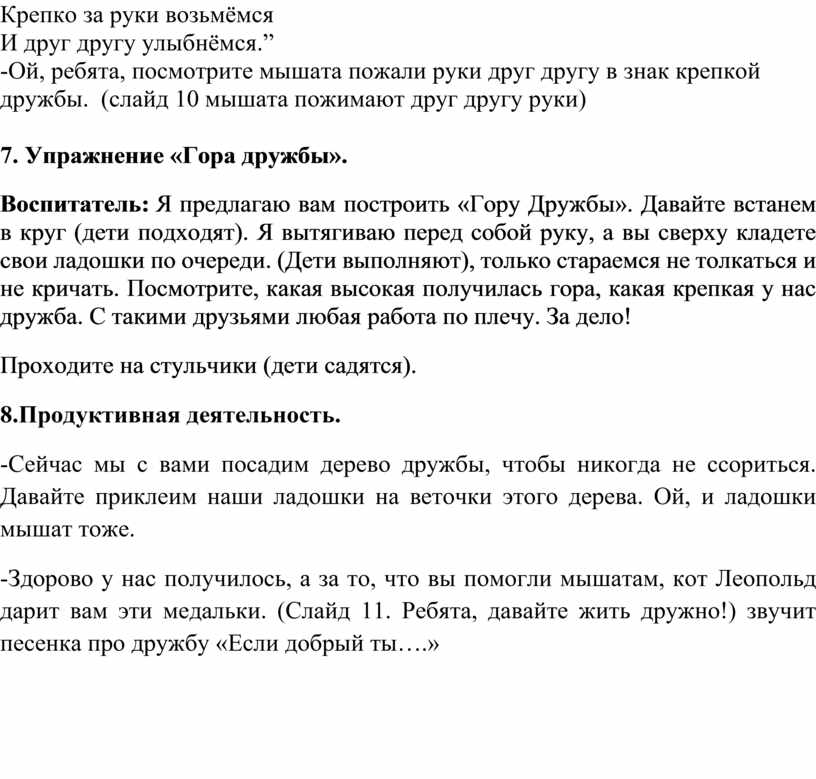 Воспитатель: Я предлагаю вам построить «Гору Дружбы». Давайте встанем в круг (дети подходят). Я вытягиваю перед собой руку, а вы сверху кладете свои ладошки по очереди. (Дети выполняют), только стараемся не толкаться и не кричать. Посмотрите, какая высокая получилась гора, какая крепкая у нас дружба. С такими друзьями любая работа по плечу. За дело!