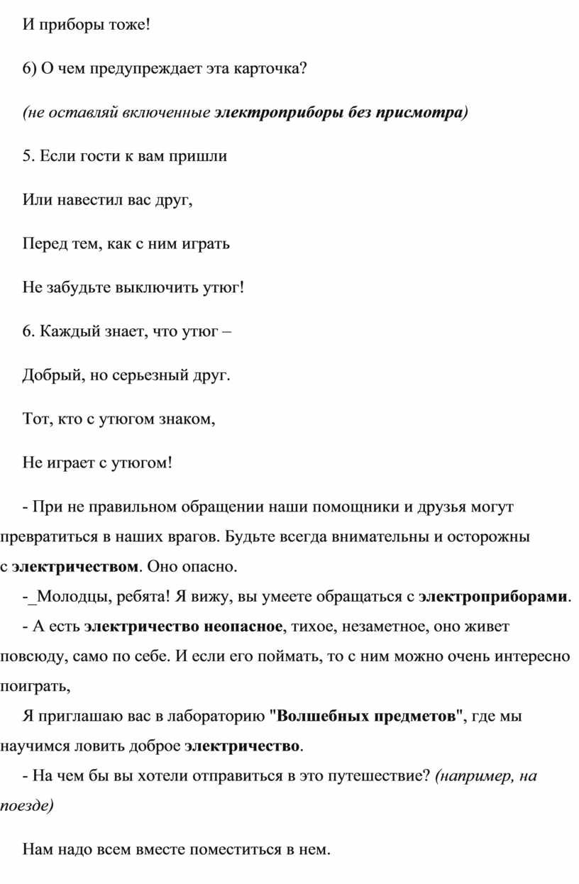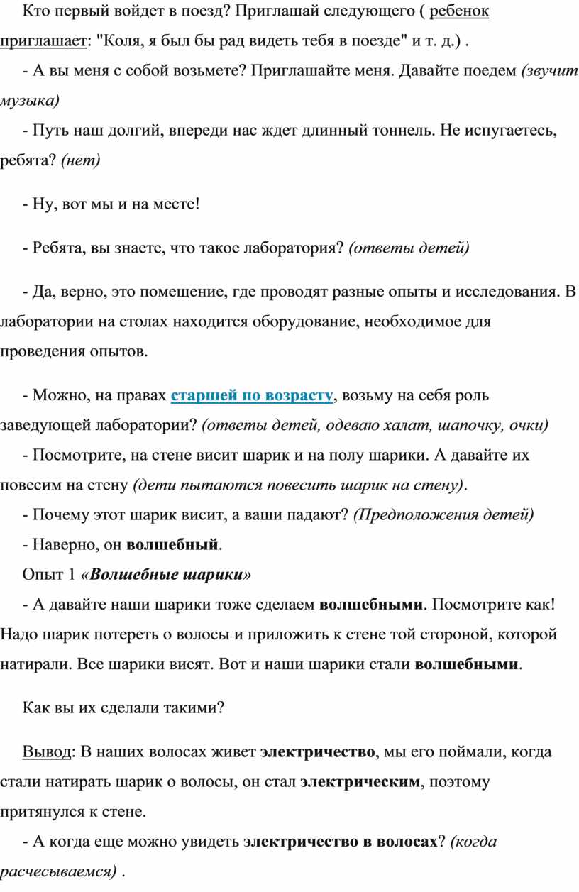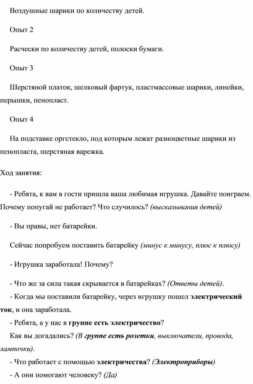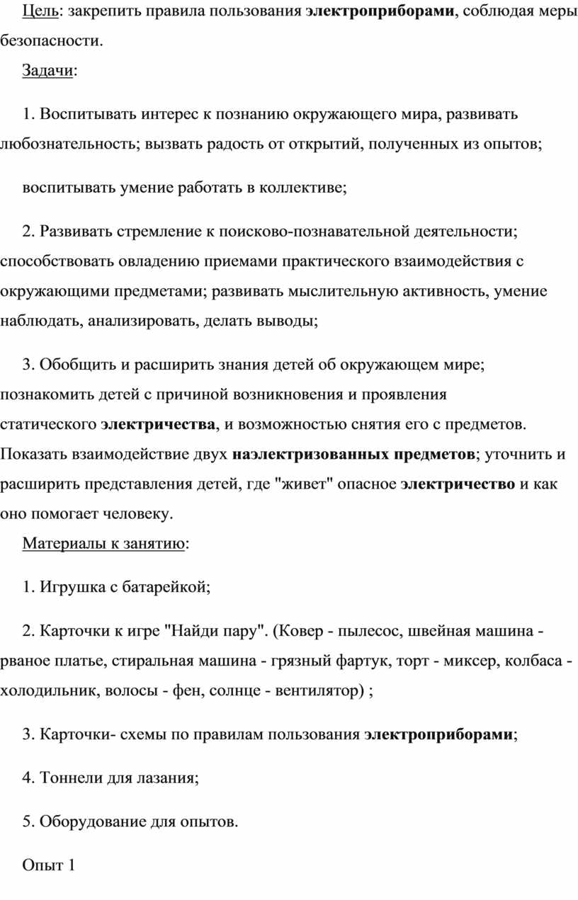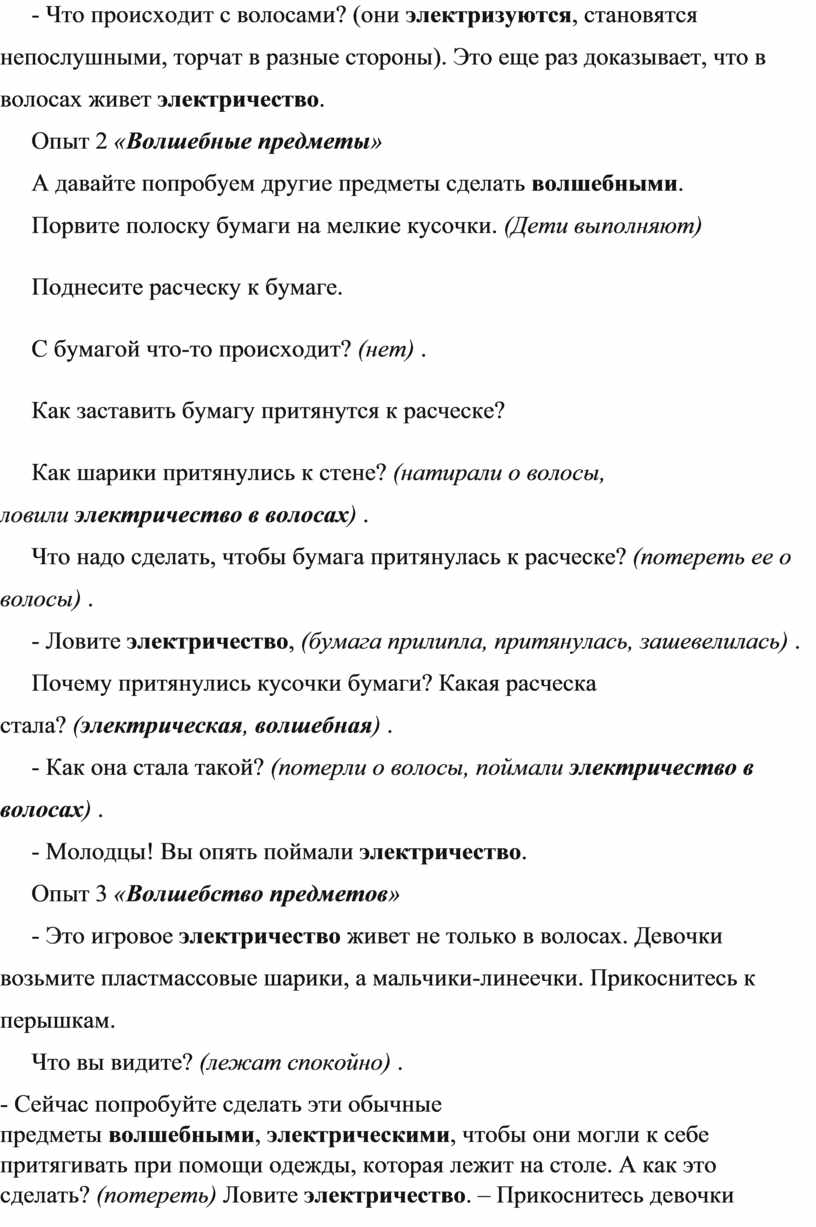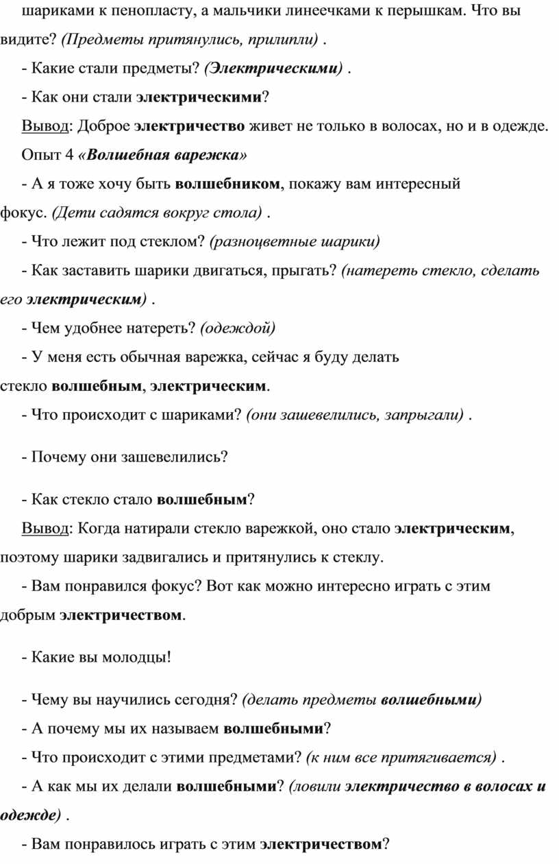 3. Обобщить и расширить знания детей об окружающем мире; познакомить детей с причиной возникновения и проявления статического электричества, и возможностью снятия его с предметов. Показать взаимодействие двух наэлектризованных предметов; уточнить и расширить представления детей, где "живет" опасное электричество и как оно помогает человеку.