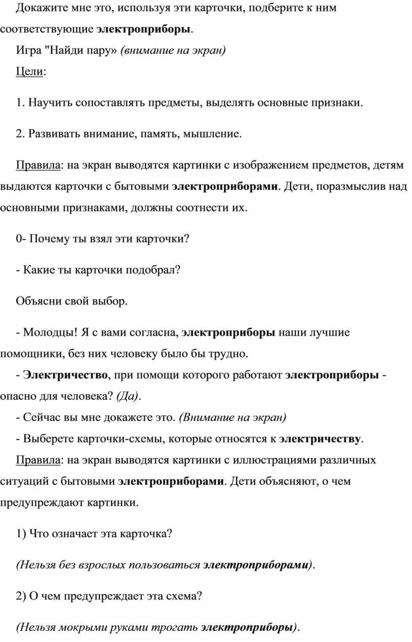 Правила: на экран выводятся картинки с изображением предметов, детям выдаются карточки с бытовыми электроприборами. Дети, поразмыслив над основными признаками, должны соотнести их.