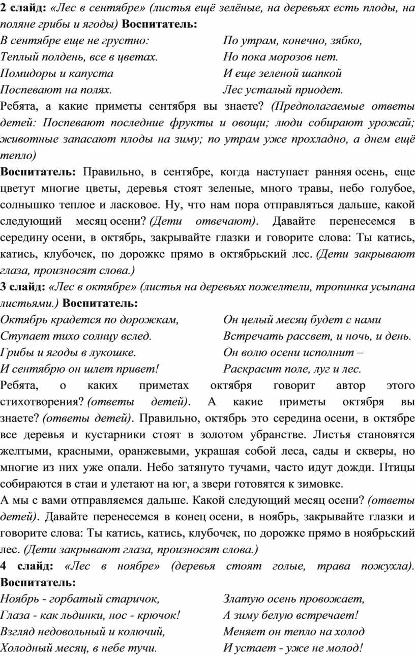 Воспитатель: Правильно, в сентябре, когда наступает ранняя осень, еще цветут многие цветы, деревья стоят зеленые, много травы, небо голубое, солнышко теплое и ласковое. Ну, что нам пора отправляться дальше, какой следующий месяц осени? (Дети отвечают). Давайте перенесемся в середину осени, в октябрь, закрывайте глазки и говорите слова: Ты катись, катись, клубочек, по дорожке прямо в октябрьский лес. (Дети закрывают глаза, произносят слова.)