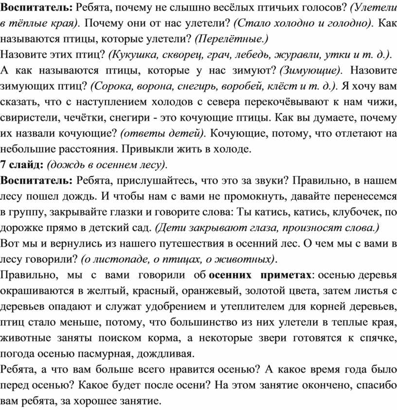 Воспитатель: Ребята, почему не слышно весёлых птичьих голосов? (Улетели в тёплые края). Почему они от нас улетели? (Стало холодно и голодно). Как называются птицы, которые улетели? (Перелётные.)