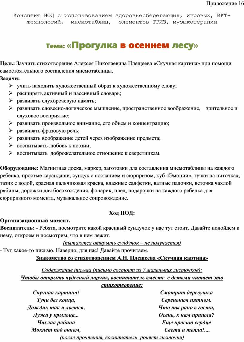 Конспект НОД с использованием здоровьесберегающих, игровых, ИКТ-технологий, мнемотаблиц, элементов ТРИЗ, музыкотерапии Тема: «Прогулка в осеннем лесу»