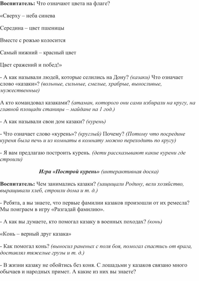 Воспитатель: Чем занимались казаки? (защищали Родину, вели хозяйство, выращивали хлеб, строили дома и т. д.)