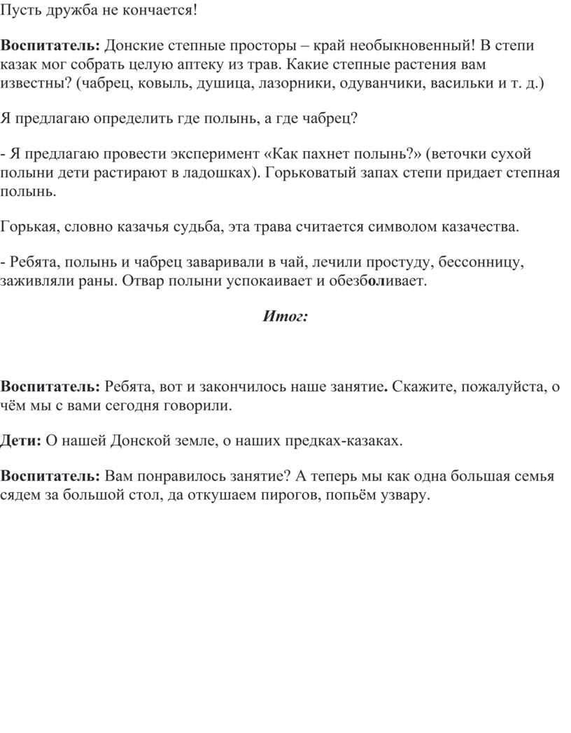Воспитатель: Донские степные просторы – край необыкновенный! В степи казак мог собрать целую аптеку из трав. Какие степные растения вам известны? (чабрец, ковыль, душица, лазорники, одуванчики, васильки и т. д.)
