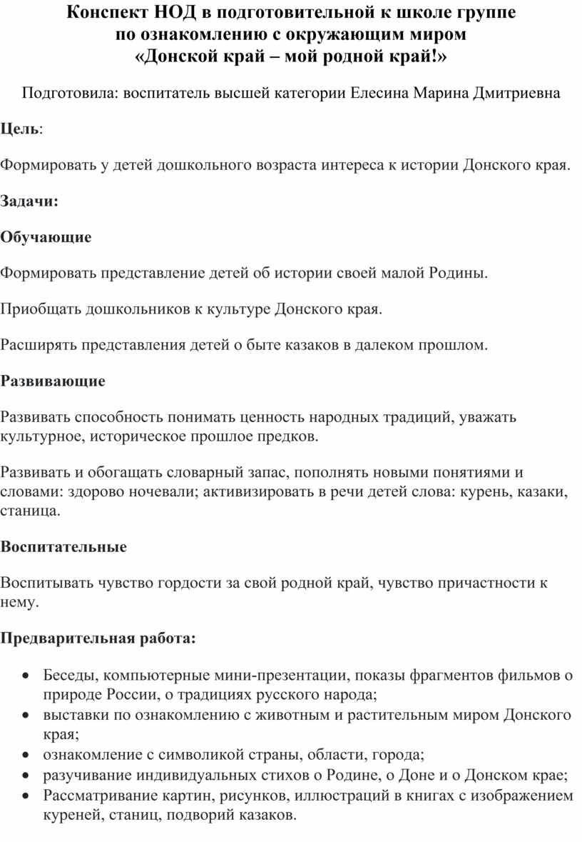 Конспект НОД в подготовительной к школе группе по ознакомлению с окружающим миром «Донской край – мой родной край!»