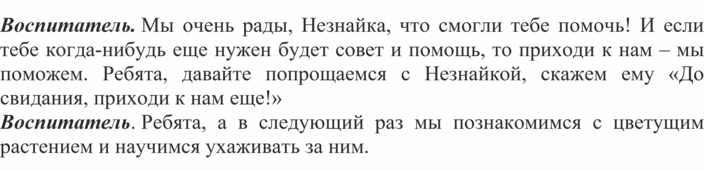 Воспитатель. Мы очень рады, Незнайка, что смогли тебе помочь! И если тебе когда-нибудь еще нужен будет совет и помощь, то приходи к нам – мы поможем. Ребята, давайте попрощаемся с Незнайкой, скажем ему «До свидания, приходи к нам еще!»