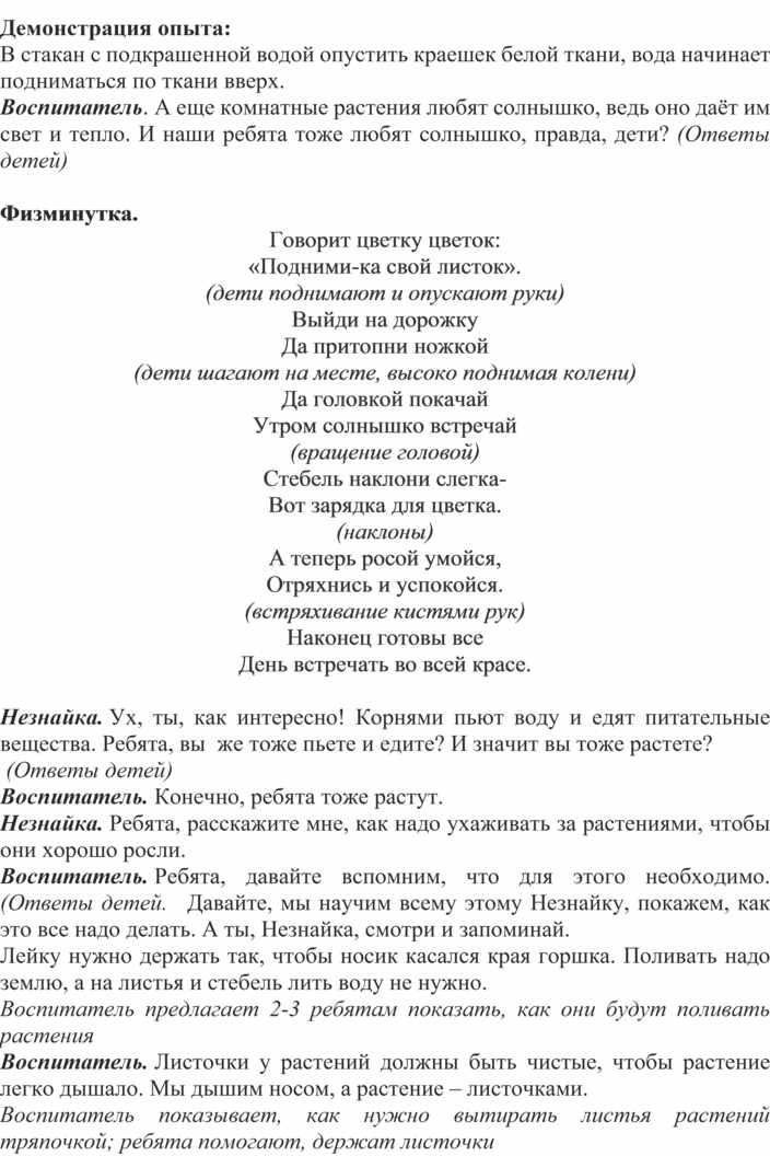 Воспитатель. Ребята, почему завял цветок? (Ответы детей) Правильно! Незнайка, цветок хочет есть и пить.