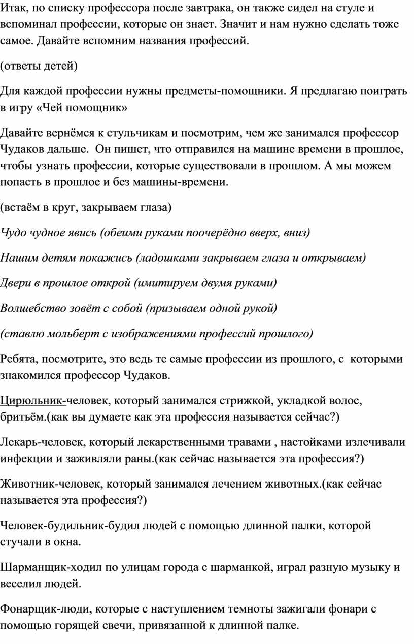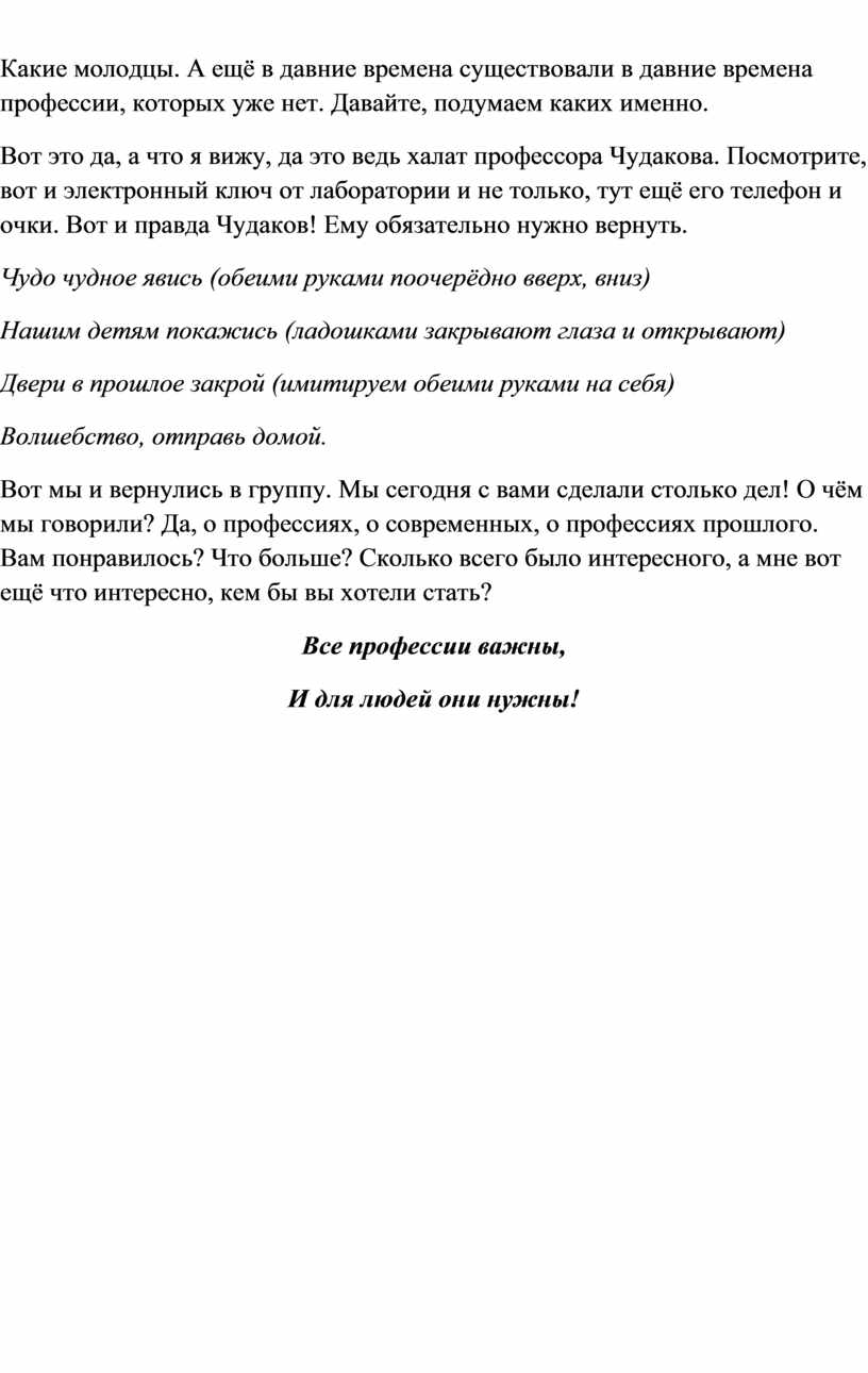 Воспитатель: Ребята, сегодня я пришла на работу и обнаружила письмо, адресованное вам. Давайте прочитаем, что же в нем написано (читает письмо).Текст письма: «Здравствуйте, ребята. Пишет вам профессор Чудаков. Мои друзья Фиксики улетели на научную встречу и мне не к кому обратиться. Я провожу важные исследования в мире профессий и мне нужно их поскорее завершить. Но потерял свой электронный ключ от лаборатории. Без ключа мне не попасть в неё. Ребята, помогите найти электронный ключ. Вам в помощь высылаю список дел, которыми занимался в день, когда потерял ключ».