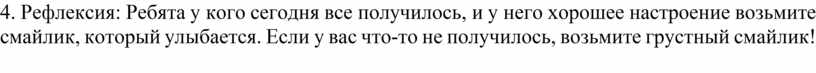 4. Рефлексия: Ребята у кого сегодня все получилось, и у него хорошее настроение возьмите смайлик, который улыбается. Если у вас что-то не получилось, возьмите грустный смайлик!