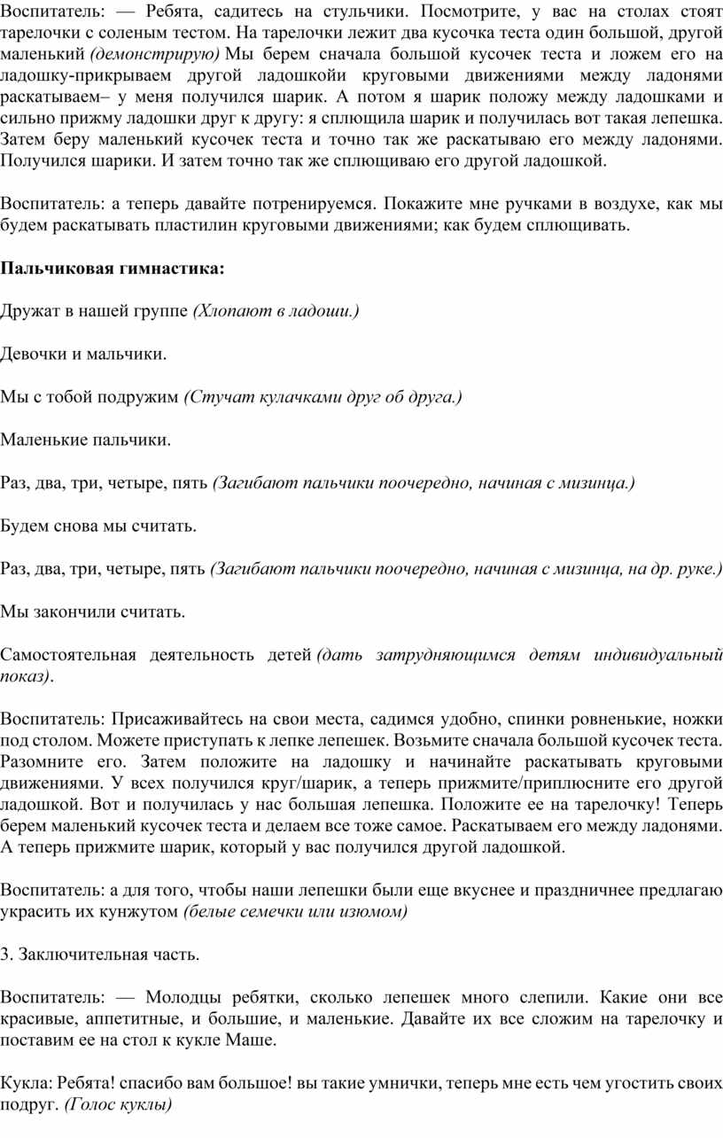 Воспитатель: — Ребята, садитесь на стульчики. Посмотрите, у вас на столах стоят тарелочки с соленым тестом. На тарелочки лежит два кусочка теста один большой, другой маленький (демонстрирую) Мы берем сначала большой кусочек теста и ложем его на ладошку-прикрываем другой ладошкойи круговыми движениями между ладонями раскатываем– у меня получился шарик. А потом я шарик положу между ладошками и сильно прижму ладошки друг к другу: я сплющила шарик и получилась вот такая лепешка. Затем беру маленький кусочек теста и точно так же раскатываю его между ладонями. Получился шарики. И затем точно так же сплющиваю его другой ладошкой.
