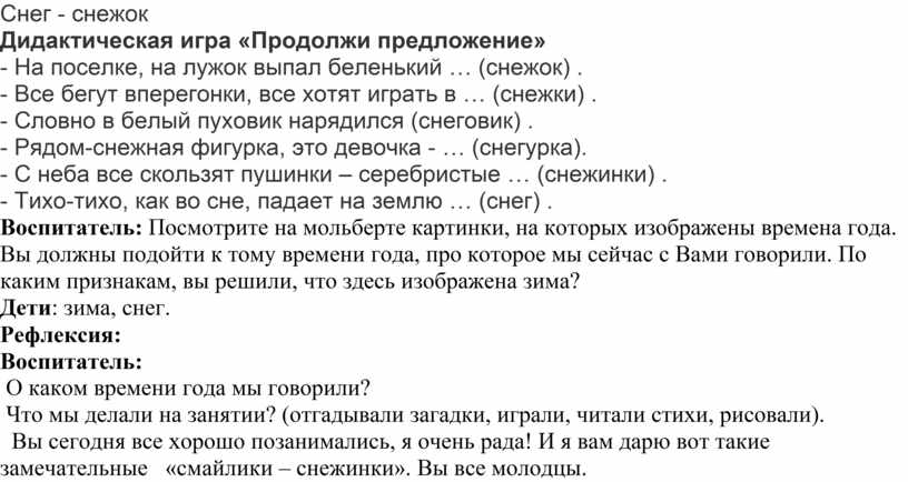 (Снежинка, мороз, Новый год, жара, санки, стрекоза, лед, рукавички, одуванчик, снеговик, Дед Мороз, листопад, Снегурочка, дождь, загорать, снегопад, лыжи, самокат, санки, метель, трава, снег, цветы, муравей).