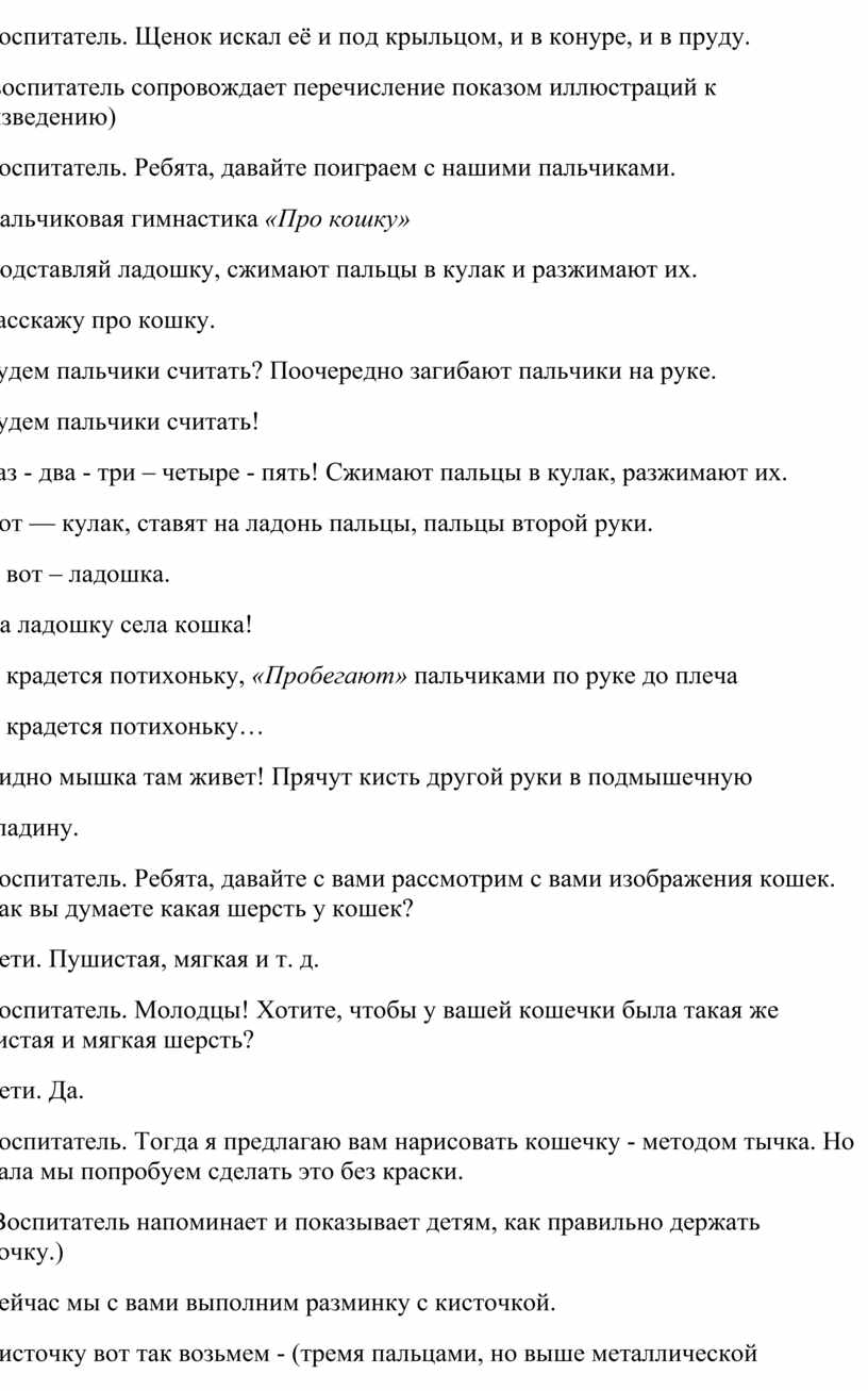 Воспитатель. Тогда я предлагаю вам нарисовать кошечку - методом тычка. Но сначала мы попробуем сделать это без краски.