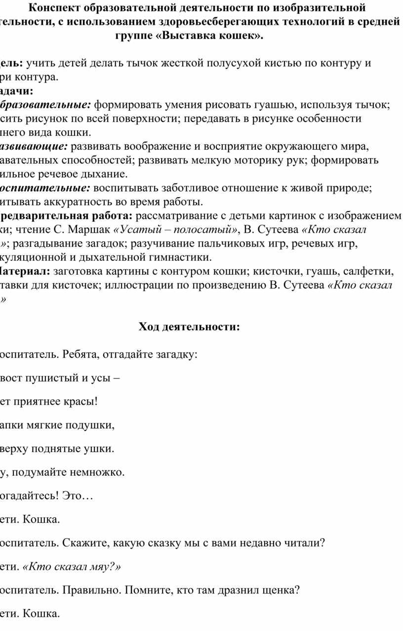 Конспект образовательной деятельности по изобразительной деятельности, с использованием здоровьесберегающих технологий в средней группе «Выставка кошек».