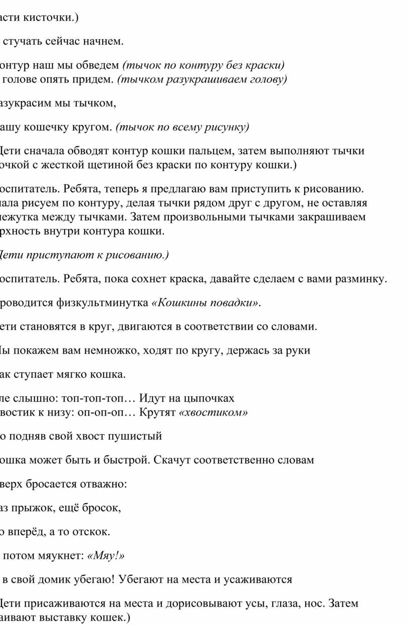 Воспитатель. Ребята, теперь я предлагаю вам приступить к рисованию. Сначала рисуем по контуру, делая тычки рядом друг с другом, не оставляя промежутка между тычками. Затем произвольными тычками закрашиваем поверхность внутри контура кошки.