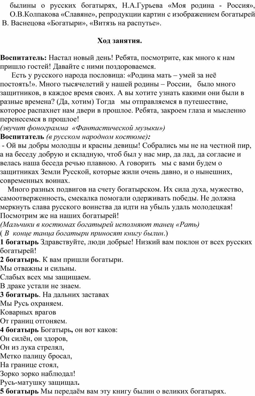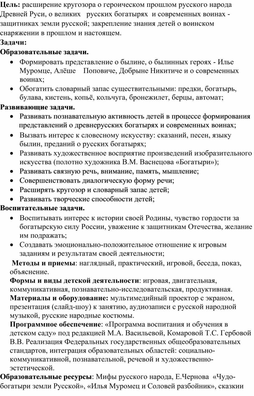 Цель: расширение кругозора о героическом прошлом русского народа Древней Руси, о великих русских богатырях и современных воинах - защитниках земли русской; закрепление знания детей о воинском снаряжении в прошлом и настоящем.
