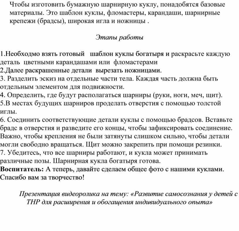 Сегодня мы хотим вам предложить изготовить бумажную куклу богатыря на шарнирах. Эти куклы можно использовать с детьми в театрализованной деятельности, для разыгрывания различных сказок, легенд и историй о богатырях, сражениях с врагами, подвигах во имя Родины и. т.д. Это развивает воображение, творческое мышление и навыки коммуникации. Дети могут создавать целую коллекцию кукол-богатырей с разными образами и характерами. Можно использовать куклу богатыря для проведения различных дидактических игр на развитие внимания, памяти, мышления, речи. Например, "Оденем богатыря", "Что лишнее?", "Найди отличия", "Составь рассказ".Кукла богатыря может стать отправной точкой для обсуждения русского фольклора, былин, исторических персонажей, оружия и доспехов русских воинов. Раскрашивание, вырезание деталей, соединение их с помощью брадсов помогает развивать мелкую моторику рук, координацию движений и аккуратность. Изготовление куклы помогает детям понять основные пропорции человеческого тела, соотношение разных частей тела. Дети могут создавать собственные истории о богатыре, придумывать ему новые подвиги и приключения, рисовать для него декорации и реквизит. Игры с богатырём помогают формировать у детей чувство патриотизма, любви к Родине, уважения к русской истории и культуре. Образ богатыря ассоциируется с такими качествами, как смелость, сила, справедливость, доброта, защита слабых. Игры с куклой могут способствовать развитию этих качеств у детей.