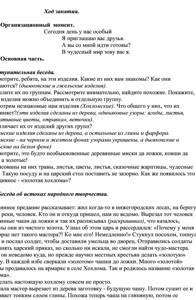 1. Вступительная беседа. Посмотрите, ребята, на эти изделия. Какие из них вам знакомы? Как они называются? (дымковские и гжельские изделия). Разделите их по группам. Рассмотрите внимательно, найдите похожие. Покажите, какие изделия можно объединить в отдельную группу. Рассмотрим незнакомые нам изделия (Хохломские). Что общего у них, что их объединяет?(эти изделия сделаны из дерева, одинаковые узоры: ягоды, листья, декоративные цветы, «травка», веточки). Что отличает их от изделий других групп? Хохломские изделия сделаны из дерева, а остальные из глины и фарфора. Хохломские - на черном и желтом фонах узорами украшены, а дымковские и гжельские на белом фоне) Посмотрите, это будто необыкновенные деревянные миски да ложки, ковши да чаши, а золотые! Нарисованы на них травы, листья, цветы, листья, сказочные жарптицы, чудесные рыбы. Такую посуду и на царский стол поставить не зазорно. Как же появилось это диво дивное - «золотая хохлома»?