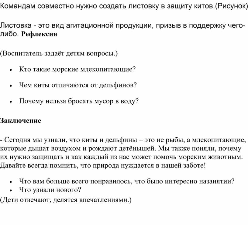 - Сегодня мы узнали, что киты и дельфины – это не рыбы, а млекопитающие, которые дышат воздухом и рождают детёнышей. Мы также поняли, почему их нужно защищать и как каждый из нас может помочь морским животным. Давайте всегда помнить, что природа нуждается в нашей заботе!