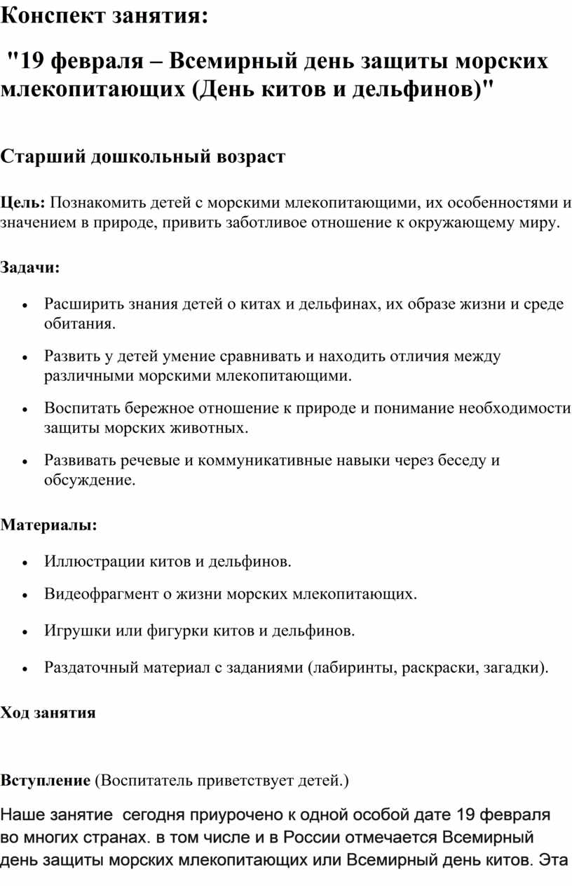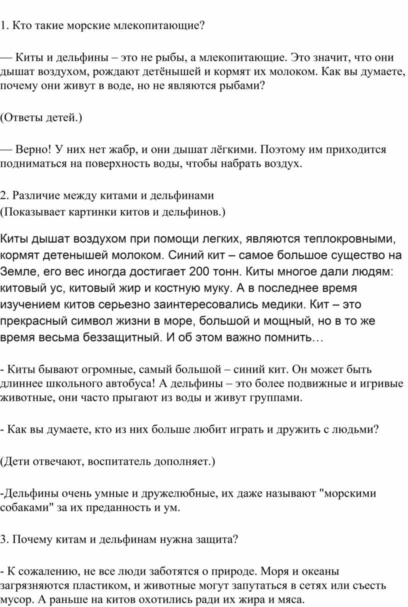 Цель: Познакомить детей с морскими млекопитающими, их особенностями и значением в природе, привить заботливое отношение к окружающему миру.