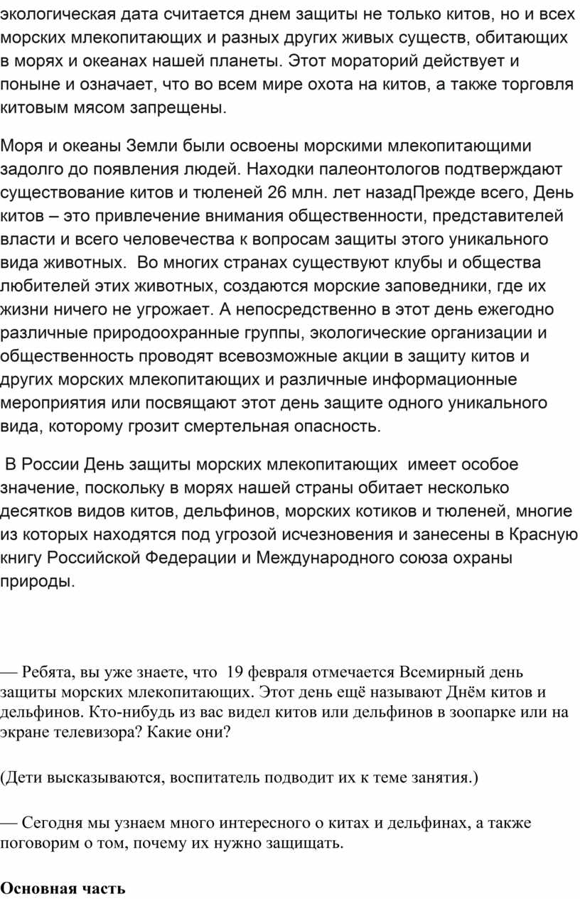 Наше занятие сегодня приурочено к одной особой дате 19 февраля во многих странах. в том числе и в России отмечается Всемирный день защиты морских млекопитающих или Всемирный день китов. Эта экологическая дата считается днем защиты не только китов, но и всех морских млекопитающих и разных других живых существ, обитающих в морях и океанах нашей планеты. Этот мораторий действует и поныне и означает, что во всем мире охота на китов, а также торговля китовым мясом запрещены.