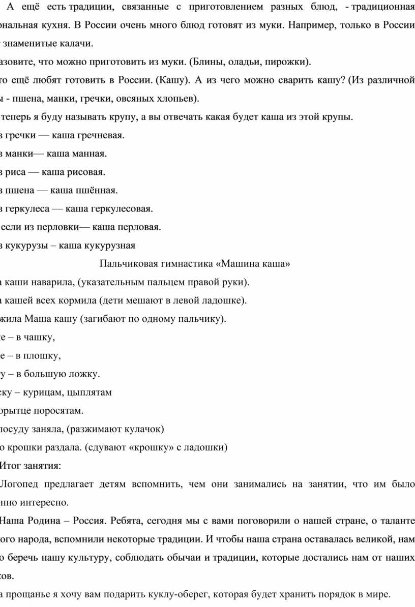 Что ещё любят готовить в России. (Кашу). А из чего можно сварить кашу? (Из различной крупы - пшена, манки, гречки, овсяных хлопьев).