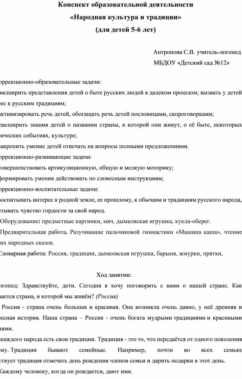 Оборудование: предметные картинки, мяч, дымковская игрушка, кукла-оберег.