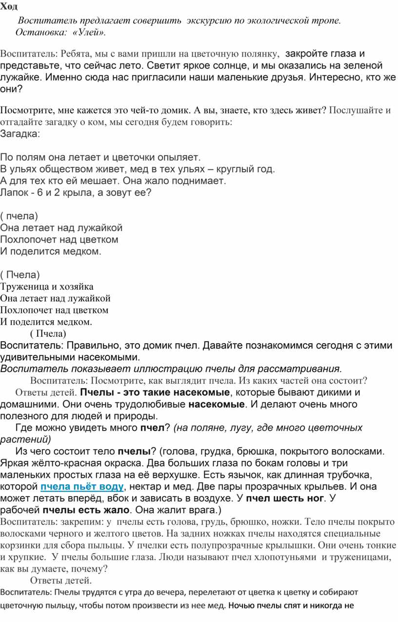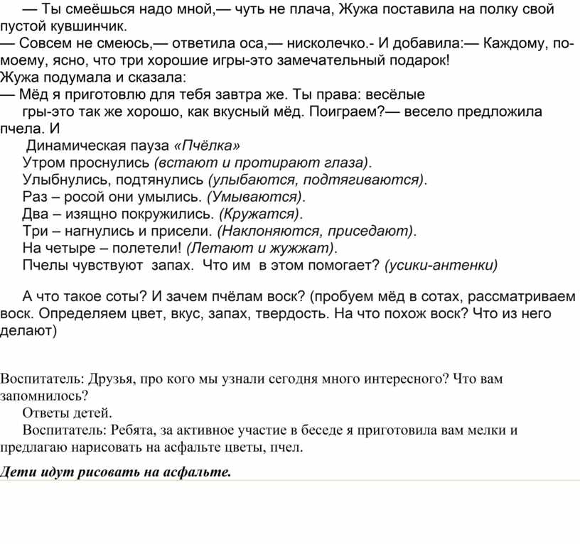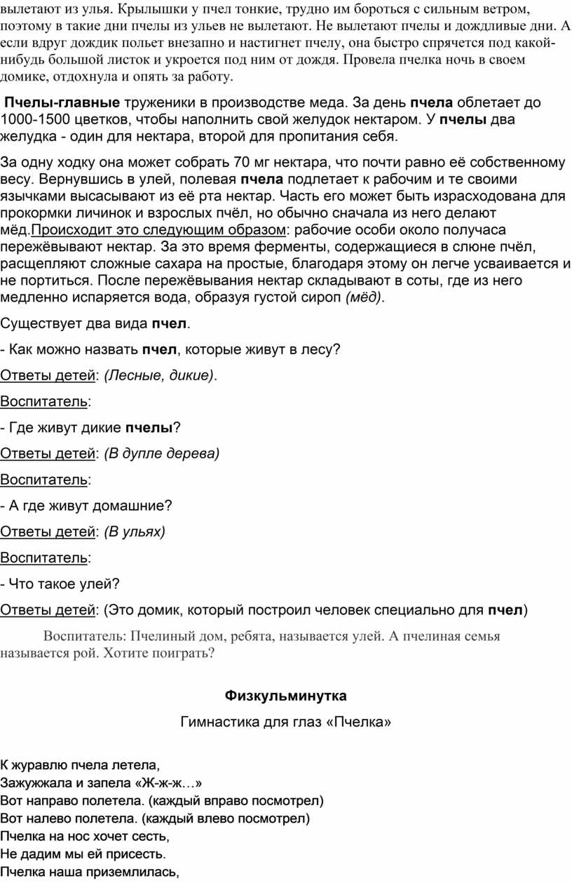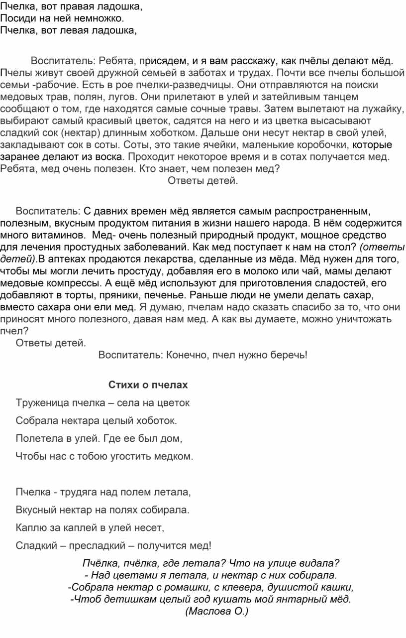 Воспитатель: Ребята, присядем, и я вам расскажу, как пчёлы делают мёд. Пчелы живут своей дружной семьей в заботах и трудах. Почти все пчелы большой семьи -рабочие. Есть в рое пчелки-разведчицы. Они отправляются на поиски медовых трав, полян, лугов. Они прилетают в улей и затейливым танцем сообщают о том, где находятся самые сочные травы. Затем вылетают на лужайку, выбирают самый красивый цветок, садятся на него и из цветка высасывают сладкий сок (нектар) длинным хоботком. Дальше они несут нектар в свой улей, закладывают сок в соты. Соты, это такие ячейки, маленькие коробочки, которые заранее делают из воска. Проходит некоторое время и в сотах получается мед. Ребята, мед очень полезен. Кто знает, чем полезен мед?