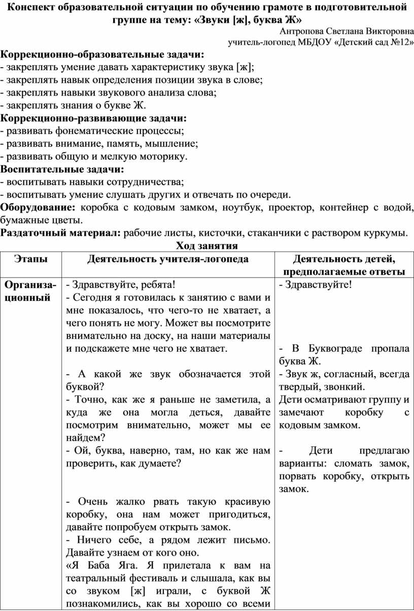 Конспект образовательной ситуации по обучению грамоте в подготовительной группе на тему: «Звуки [ж], буква Ж»