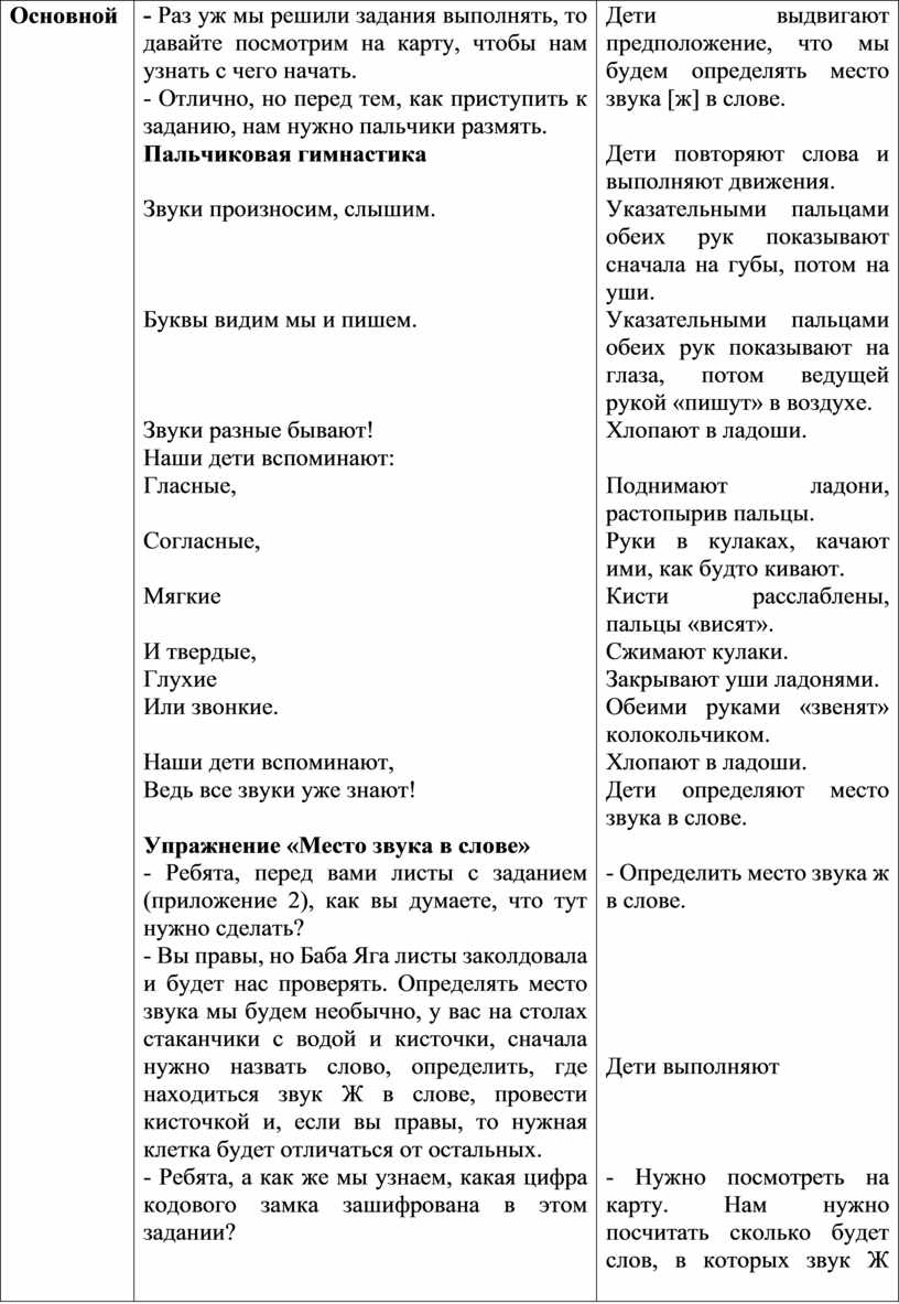 Упражнение «Место звука в слове» - Ребята, перед вами листы с заданием (приложение 2), как вы думаете, что тут нужно сделать? - Вы правы, но Баба Яга листы заколдовала и будет нас проверять. Определять место звука мы будем необычно, у вас на столах стаканчики с водой и кисточки, сначала нужно назвать слово, определить, где находиться звук Ж в слове, провести кисточкой и, если вы правы, то нужная клетка будет отличаться от остальных. - Ребята, а как же мы узнаем, какая цифра кодового замка зашифрована в этом задании?