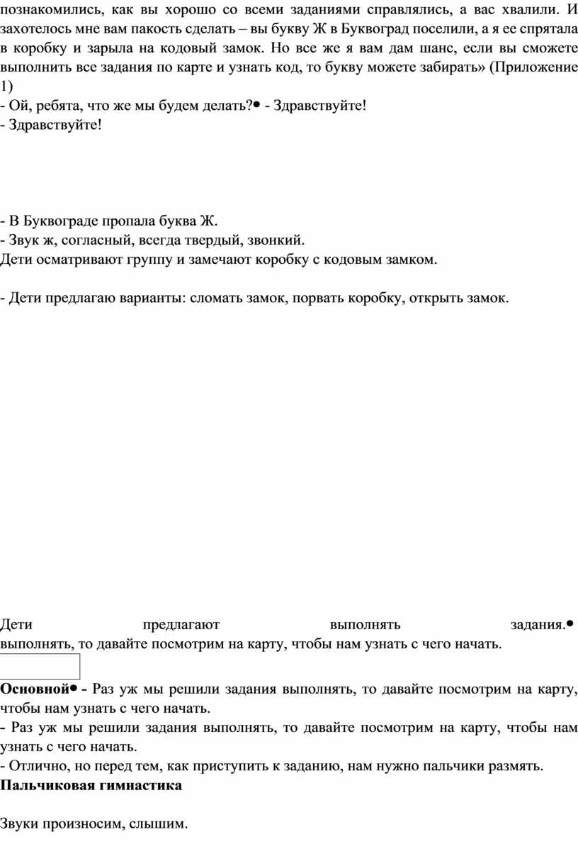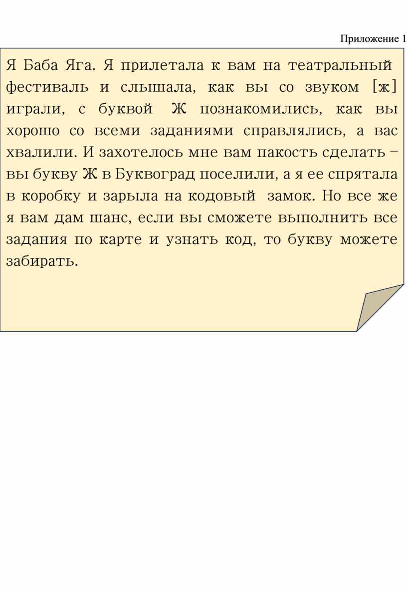 - Очень жалко рвать такую красивую коробку, она нам может пригодиться, давайте попробуем открыть замок. - Ничего себе, а рядом лежит письмо. Давайте узнаем от кого оно. «Я Баба Яга. Я прилетала к вам на театральный фестиваль и слышала, как вы со звуком [ж] играли, с буквой Ж познакомились, как вы хорошо со всеми заданиями справлялись, а вас хвалили. И захотелось мне вам пакость сделать – вы букву Ж в Буквоград поселили, а я ее спрятала в коробку и зарыла на кодовый замок. Но все же я вам дам шанс, если вы сможете выполнить все задания по карте и узнать код, то букву можете забирать» (Приложение 1) - Ой, ребята, что же мы будем делать? |