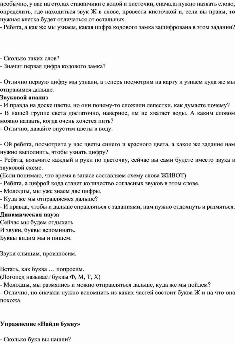 - Ой ребята, посмотрите у нас цветы синего и красного цвета, а какое же задание нам нужно выполнить, чтобы узнать цифру? - Ребята, возьмите каждый в руки по цветочку, сейчас вы сами будете вместо звука в звуковой схеме. (Если понимаю, что время в запасе составляем схему слова ЖИВОТ) - Ребята, а цифрой кода станет количество согласных звуков в этом слове. - Молодцы, мы уже знаем две цифры. - Куда же мы отправляемся дальше? - И правда, чтобы и дальше справляться с заданиями, нам нужно отдохнуть и размяться. Динамическая пауза Сейчас мы будем отдыхать И звуки, буквы вспоминать. Буквы видим мы и пишем.