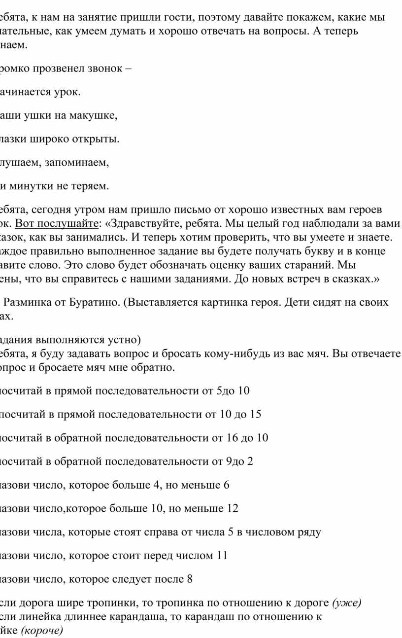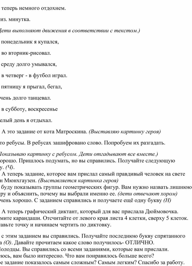 Ребята, сегодня утром нам пришло письмо от хорошо известных вам героев сказок. Вот послушайте: «Здравствуйте, ребята. Мы целый год наблюдали за вами из сказок, как вы занимались. И теперь хотим проверить, что вы умеете и знаете. За каждое правильно выполненное задание вы будете получать букву и в конце составите слово. Это слово будет обозначать оценку ваших стараний. Мы уверены, что вы справитесь с нашими заданиями. До новых встреч в сказках.»