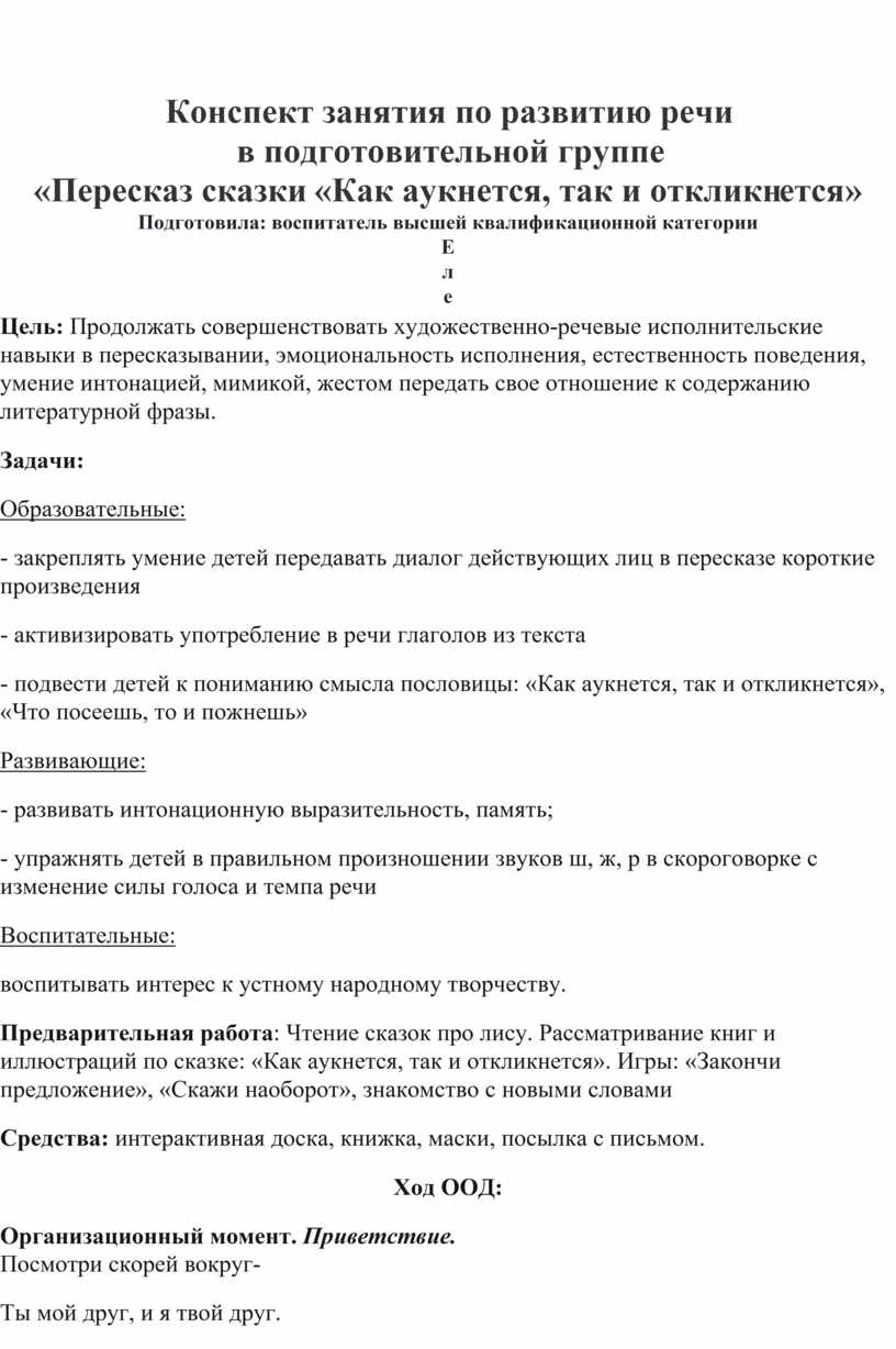 Конспект ООД по развитию речи в подготовительной группе «Пересказ сказки «Как аукнется, так и откликнется»