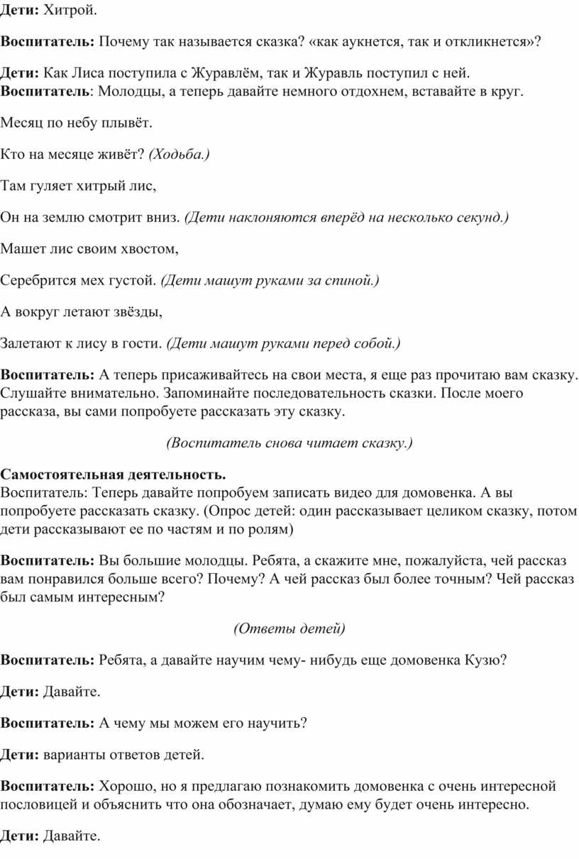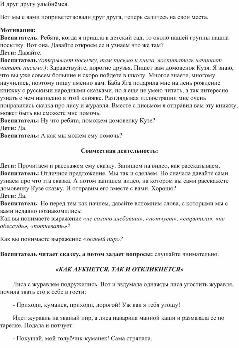 Воспитатель:(открывает посылку, там письмо и книга, воспитатель начинает читать письмо.): Здравствуйте, дорогие друзья. Пишет вам домовенок Кузя. Я знаю, что вы уже совсем большие и скоро пойдете в школу. Многое знаете, многому научились, поэтому пишу именно вам. Баба Яга подарила мне на день рождение книжку с русскими народными сказками, но я еще не умею читать, а так интересно узнать о чем написано в этой книжке. Разглядывая иллюстрации мне очень понравилась сказка про лису и журавля. Вместе с письмом я отправил вам эту книжку, может быть вы сможете мне помочь.