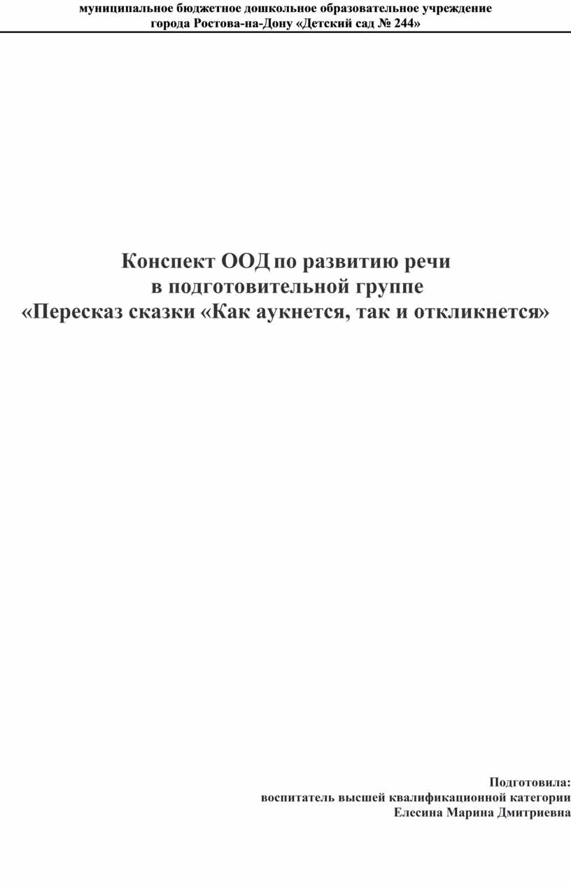 Конспект занятия по развитию речи в подготовительной группе «Пересказ сказки «Как аукнется, так и откликнется» Подготовила: воспитатель высшей квалификационной категории Елесина Марина Дмитриевна