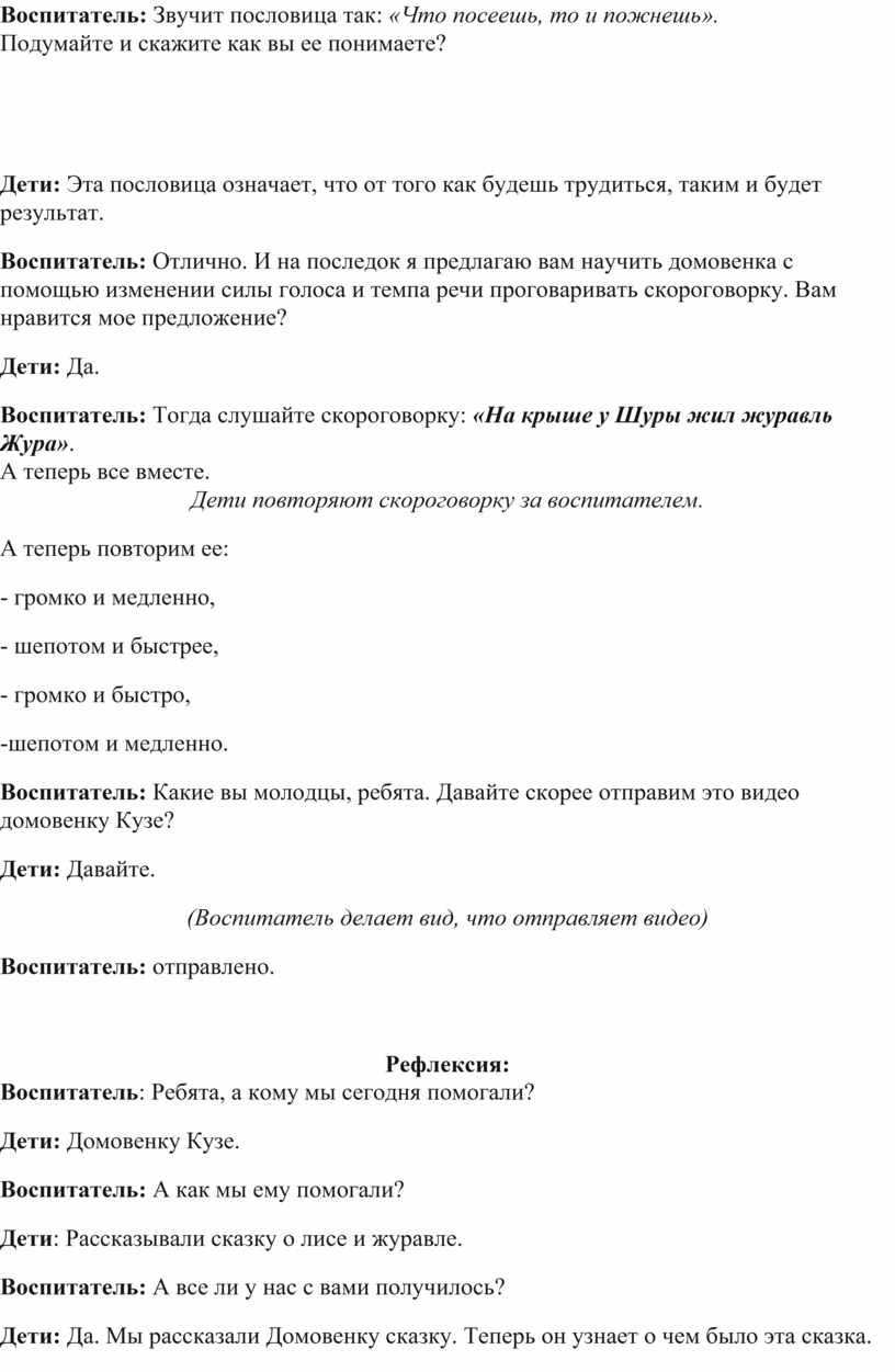 Воспитатель: Отлично. И на последок я предлагаю вам научить домовенка с помощью изменении силы голоса и темпа речи проговаривать скороговорку. Вам нравится мое предложение?
