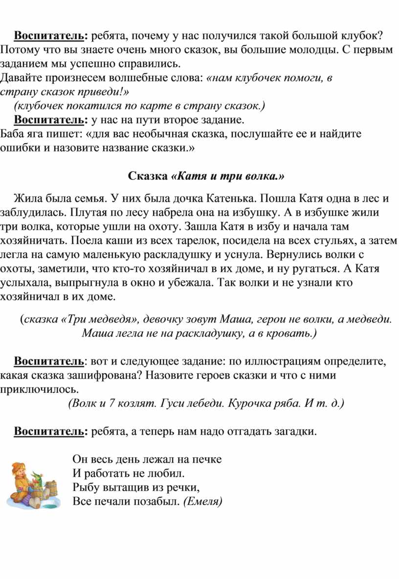 Воспитатель: ребята, почему у нас получился такой большой клубок? Потому что вы знаете очень много сказок, вы большие молодцы. С первым заданием мы успешно справились.